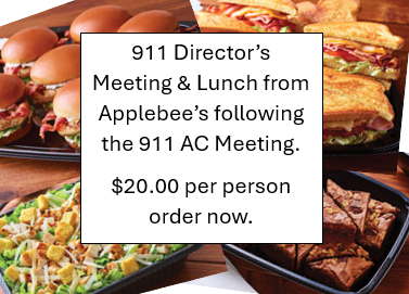 Stay after the State 911 Advisory Meeting for lunch and a Director's meeting. Lunch will be catered by Applebees. You can identify your preferred catered lunch option when you check out. Full agenda coming, but some of the topics will include: Statewide CAD Interface DRS proposed rules for PSERS retirement 911 Excise Tax funding
